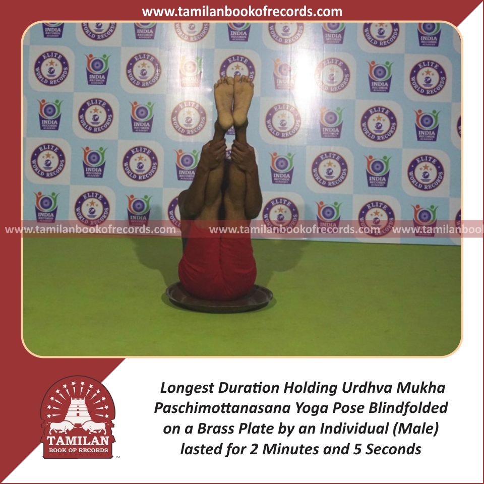Longest Duration Holding Urdhva Mukha Paschimottanasana Yoga Pose Blindfolded on a Brass Plate by an Individual (Male)