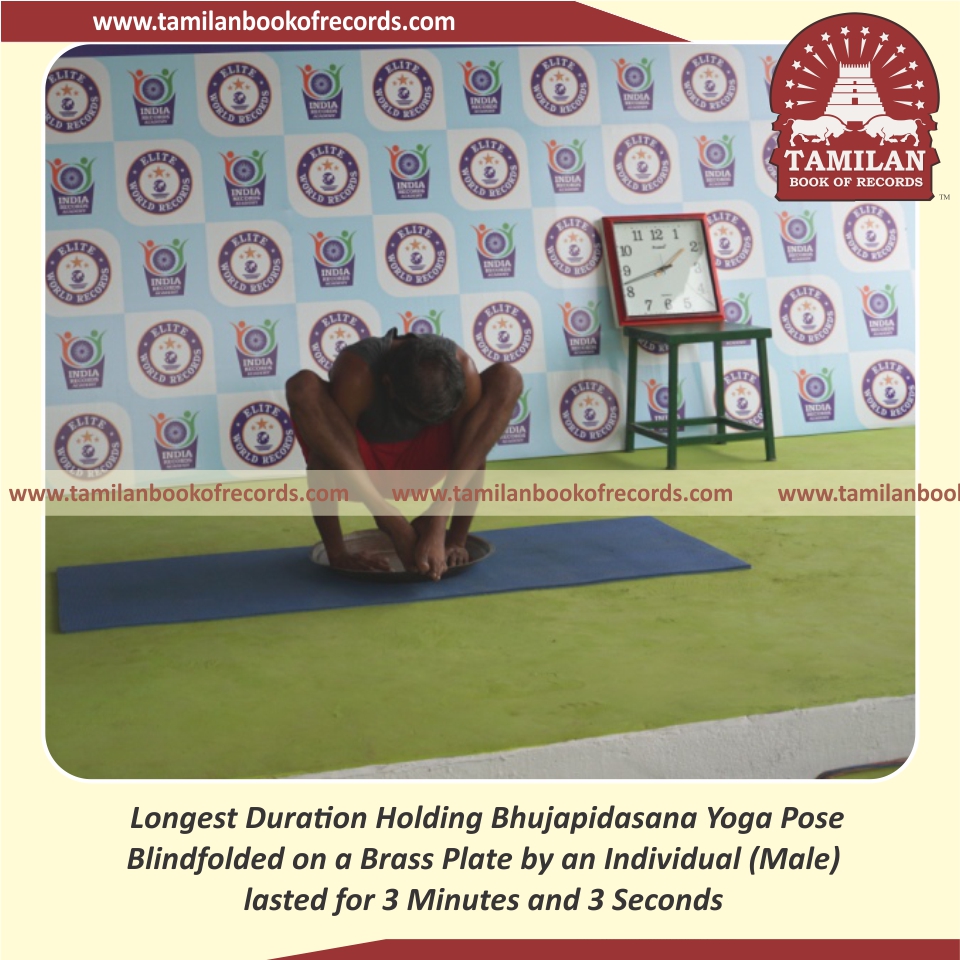 Longest Duration Holding Bhujapidasana Yoga Pose Blindfolded on a Brass Plate by an Individual (Male)