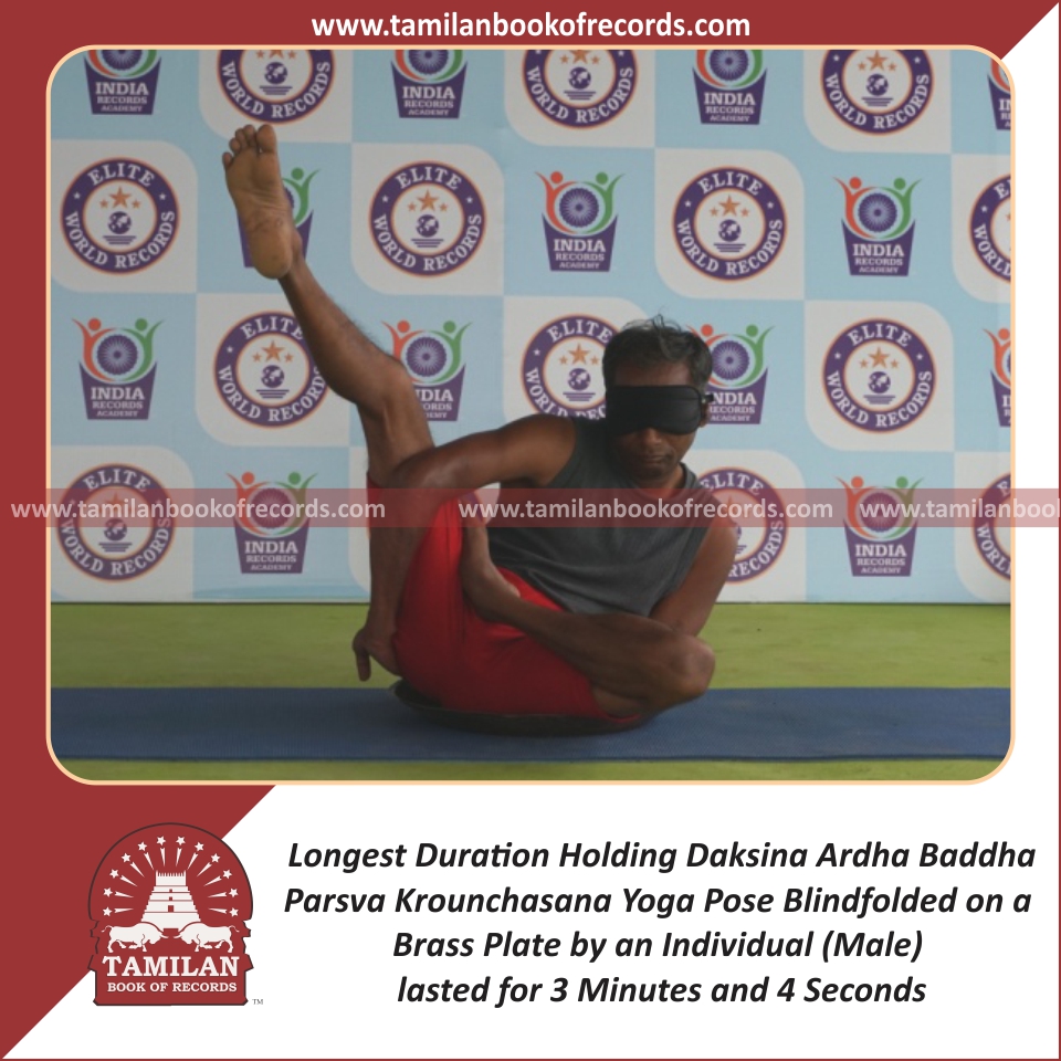 Longest Duration Holding Vama Ardha Baddha Parsva Krounchasana Yoga Pose Blindfolded on a Brass Plate by an Individual (Male)