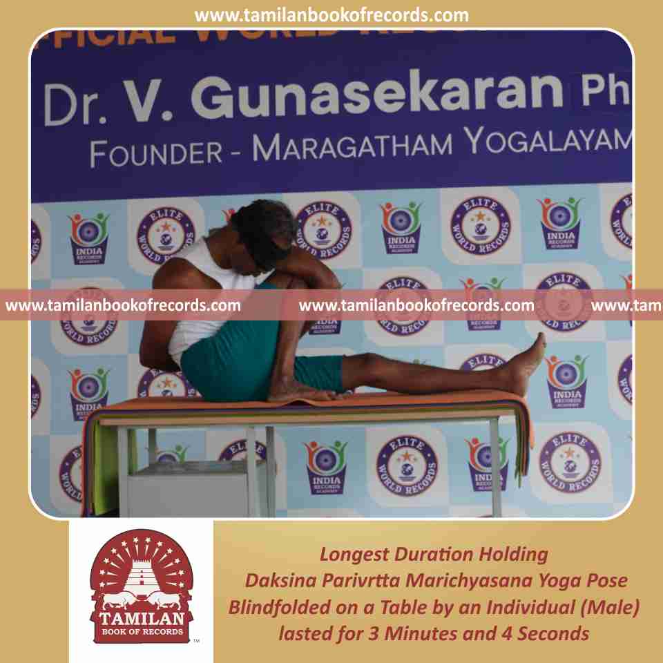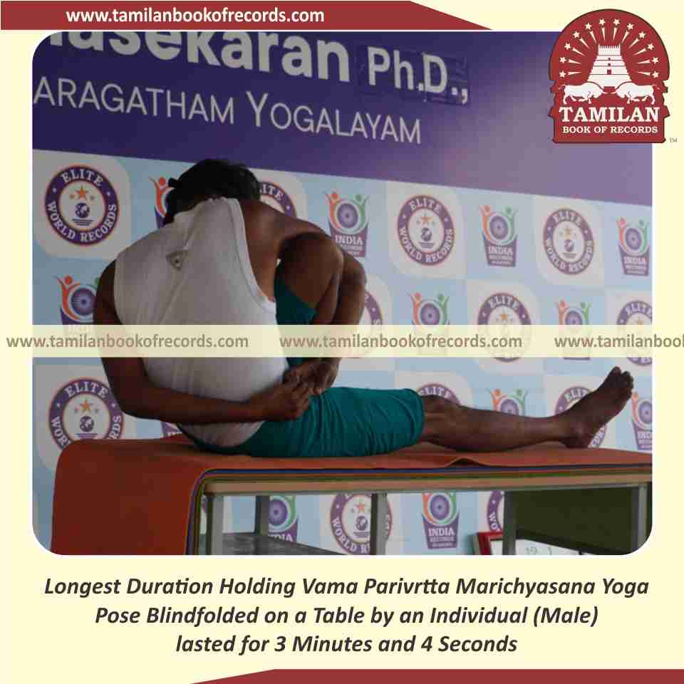 Longest Duration Holding Vama Parivrtta Marichyasana Yoga Pose Blindfolded on a Table by an Individual (Male)
