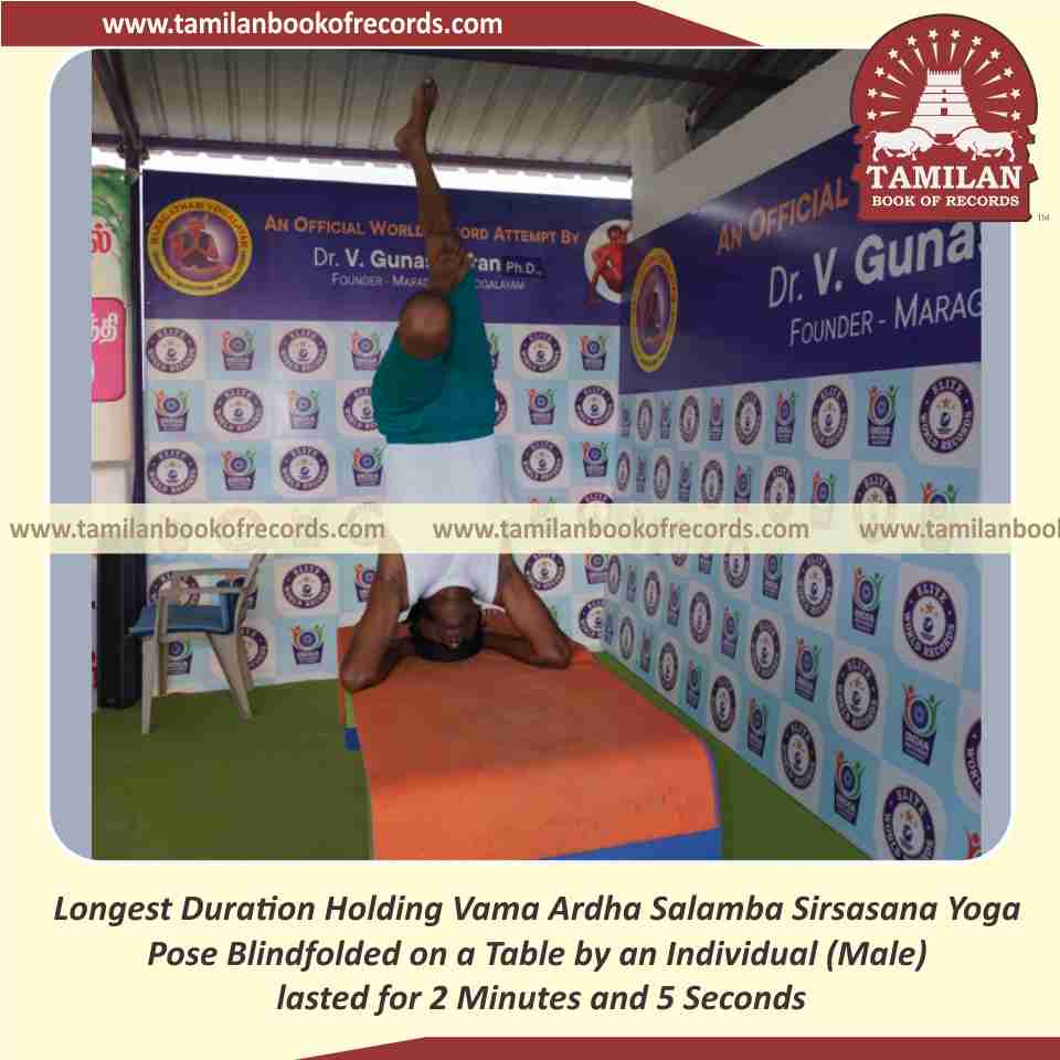 Longest Duration Holding Vama Ardha Salamba Sirsasana Yoga Pose Blindfolded on a Table by an Individual (Male)