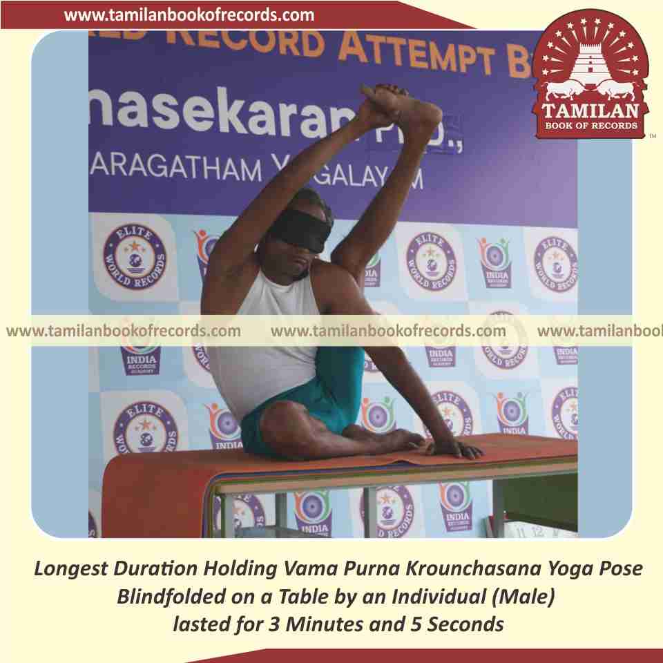 Longest Duration Holding Vama Purna Krounchasana Yoga Pose Blindfolded on a Table by an Individual (Male)