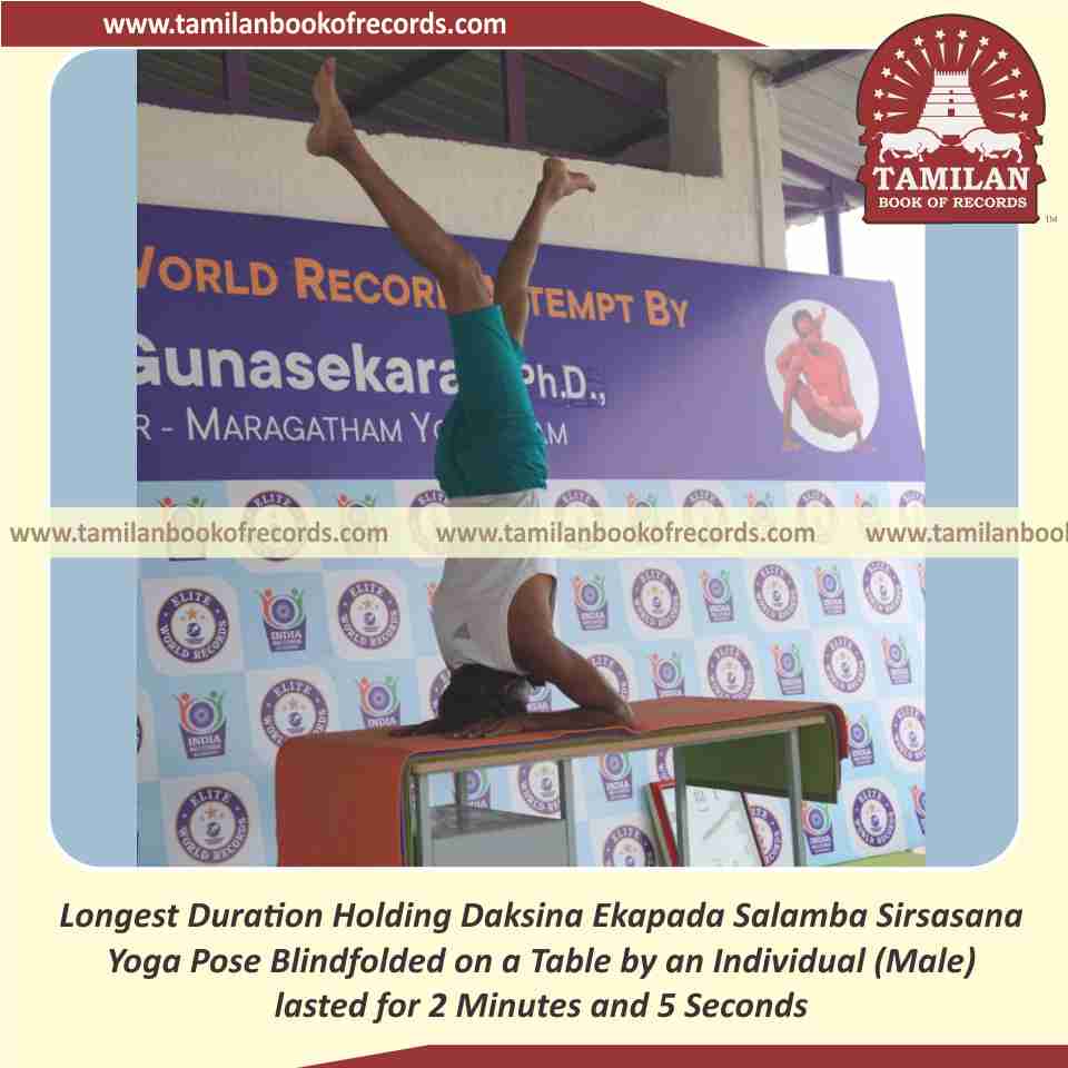 Longest Duration Holding Daksina Ekapada Salamba Sirsasana Yoga Pose Blindfolded on a Table by an Individual (Male)