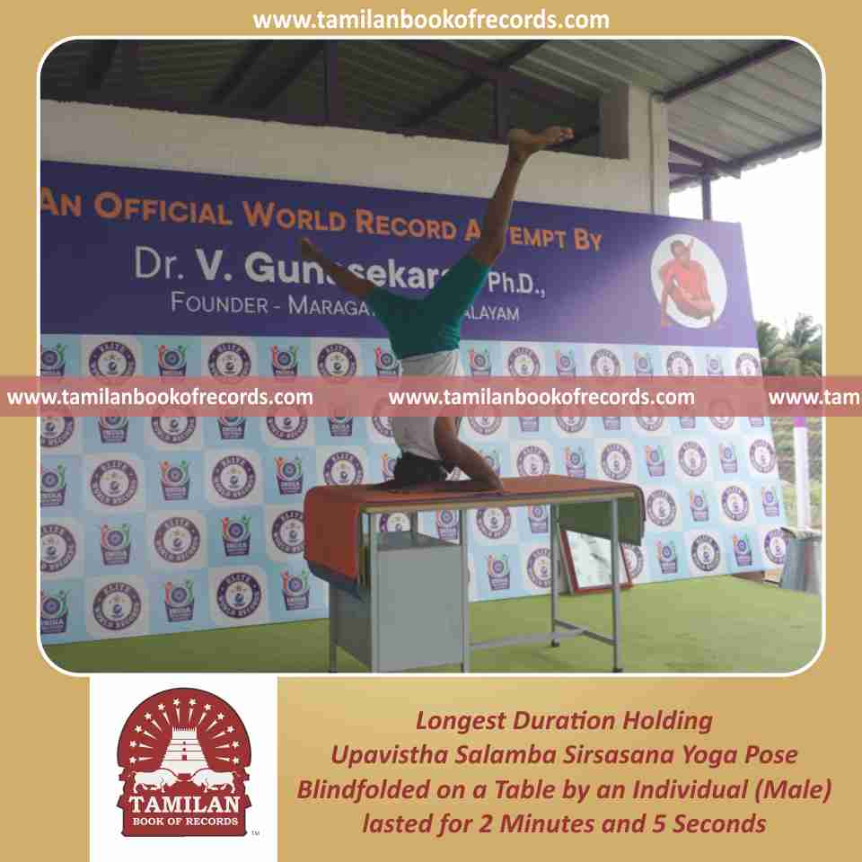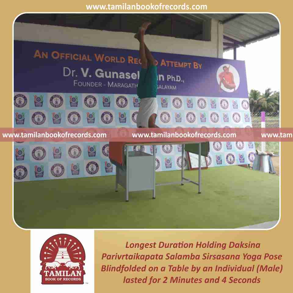 Longest Duration Holding Daksina Parivrtaikapata Salamba Sirsasana Yoga Pose Blindfolded on a Table by an Individual (Male)