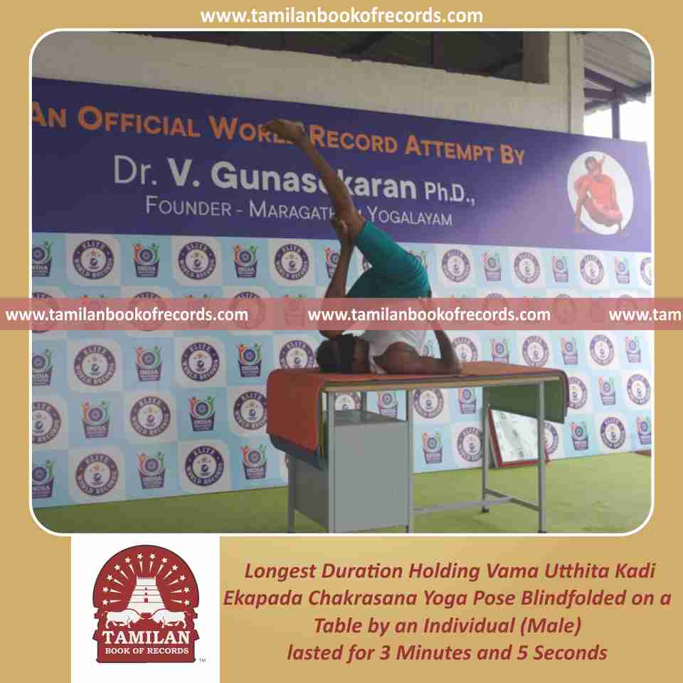 Longest Duration Holding Vama Utthita Kadi Ekapada Chakrasana Yoga Pose Blindfolded on a Table by an Individual (Male)