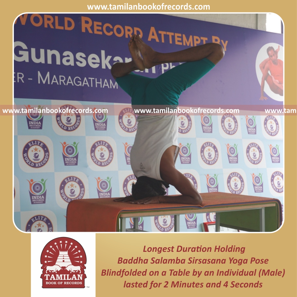 Longest Duration Holding Baddha Salamba Sirsasana Yoga Pose Blindfolded on a Table by an Individual (Male)