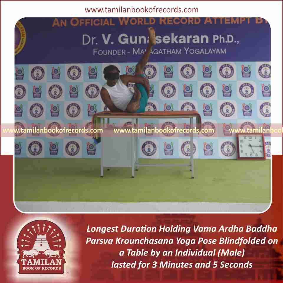 Longest Duration Holding Vama Ardha Baddha Parsva Krounchasana Yoga Pose Blindfolded on a Table by an Individual (Male)
