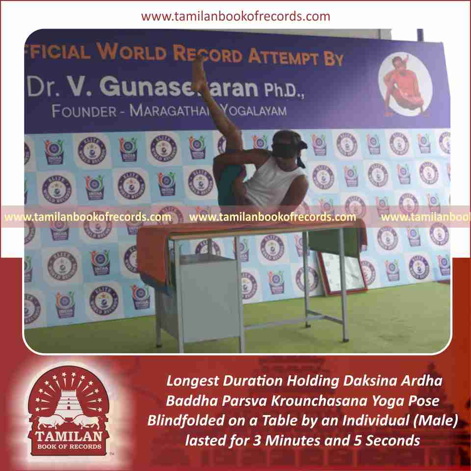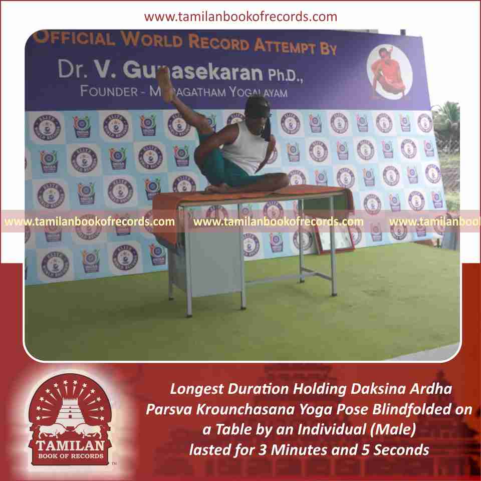 Longest Duration Holding Daksina Ardha Baddha Parsva Krounchasana Yoga Pose Blindfolded on a Table by an Individual (Male)