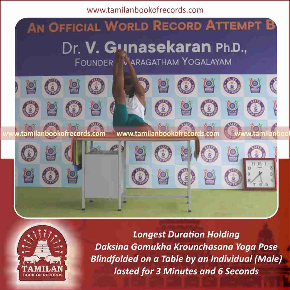 Longest Duration Holding Daksina Gomukha Krounchasana Yoga Pose Blindfolded on a Table by an Individual (Male)