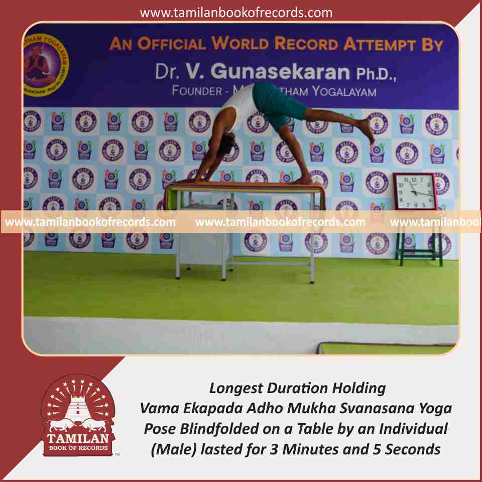 Longest Duration Holding Vama Ekapada Adho Mukha Svanasana Yoga Pose Blindfolded on a Table by an Individual (Male)