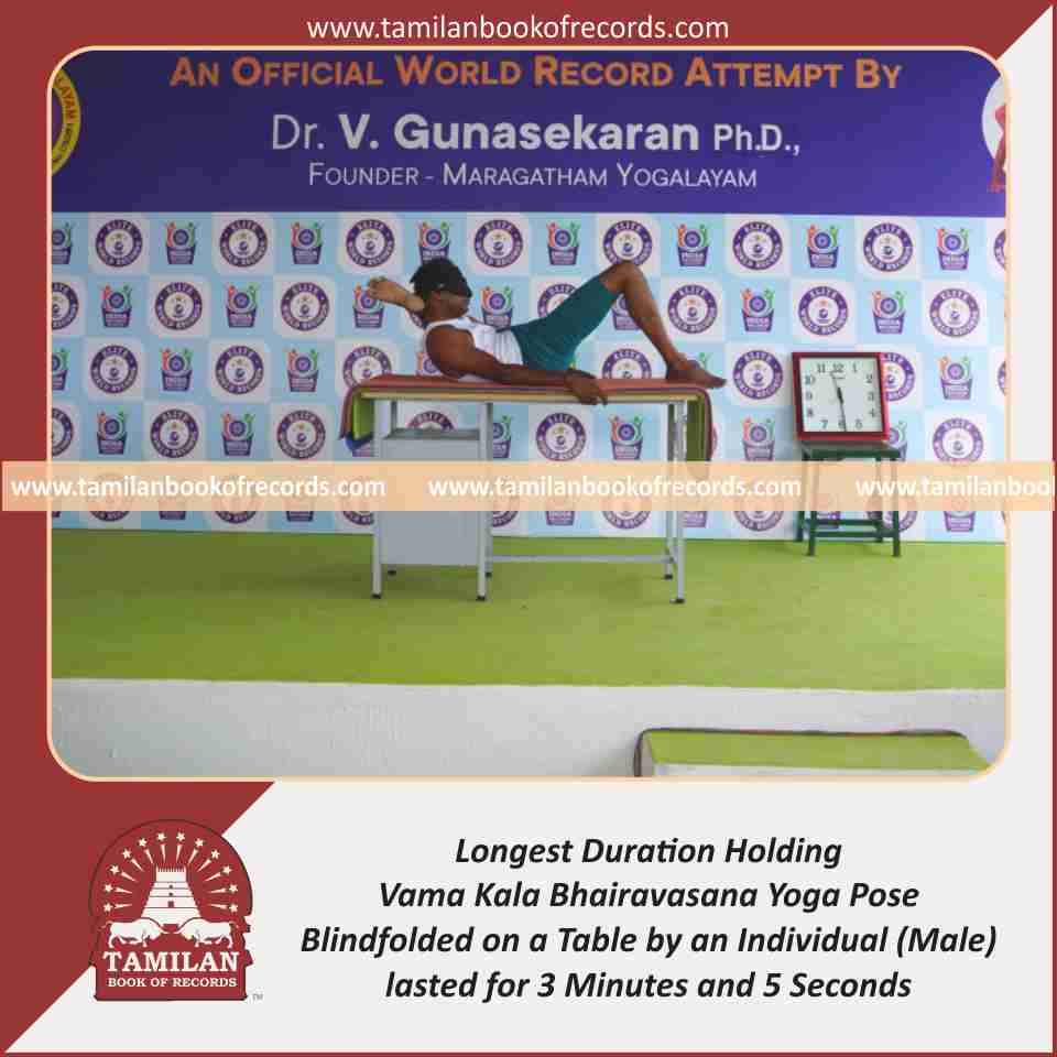 Longest Duration Holding Vama Kala Bhairavasana Yoga Pose Blindfolded on a Table by an Individual (Male)