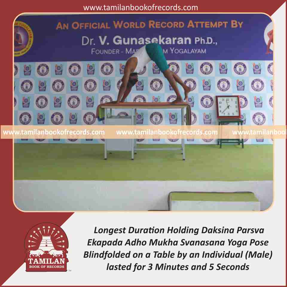 Longest Duration Holding Daksina Parsva Ekapada Adho Mukha Svanasana Yoga Pose Blindfolded on a Table by an Individual (Male)