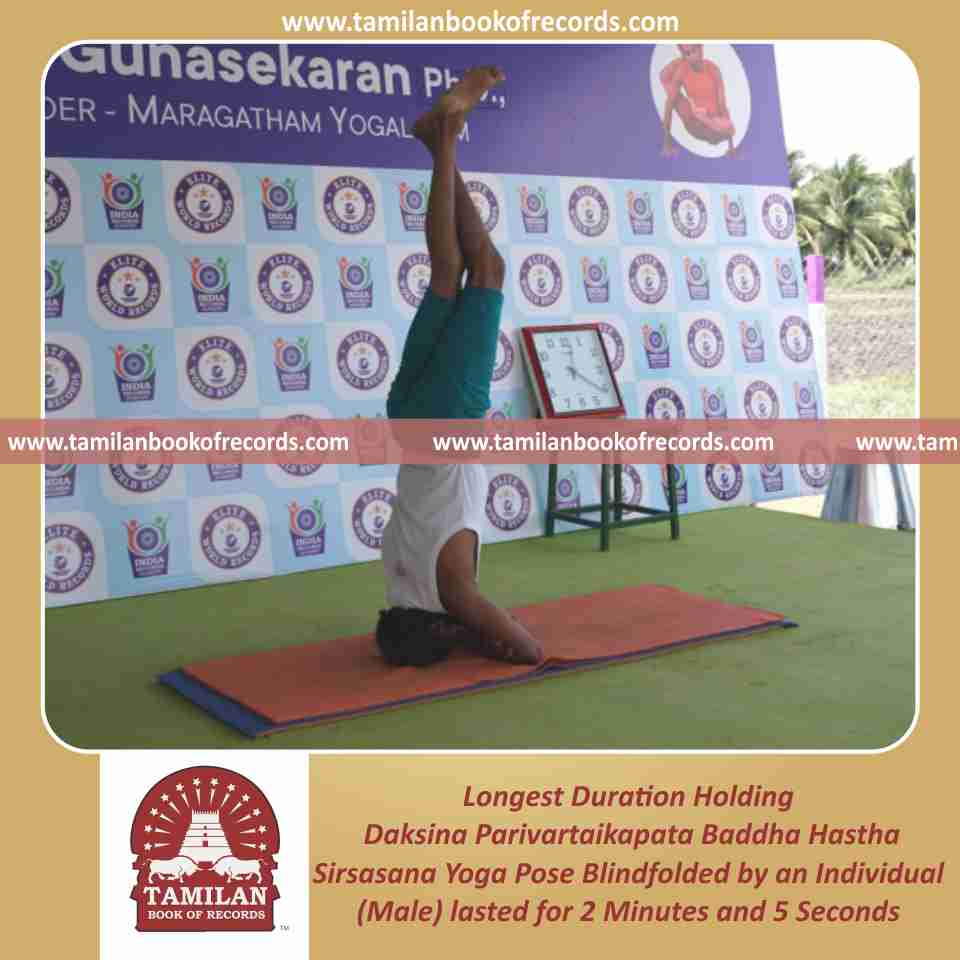 Longest Duration Holding Daksina Parivartaikapata Baddha Hastha Sirsasana Yoga Pose Blindfolded by an Individual (Male)