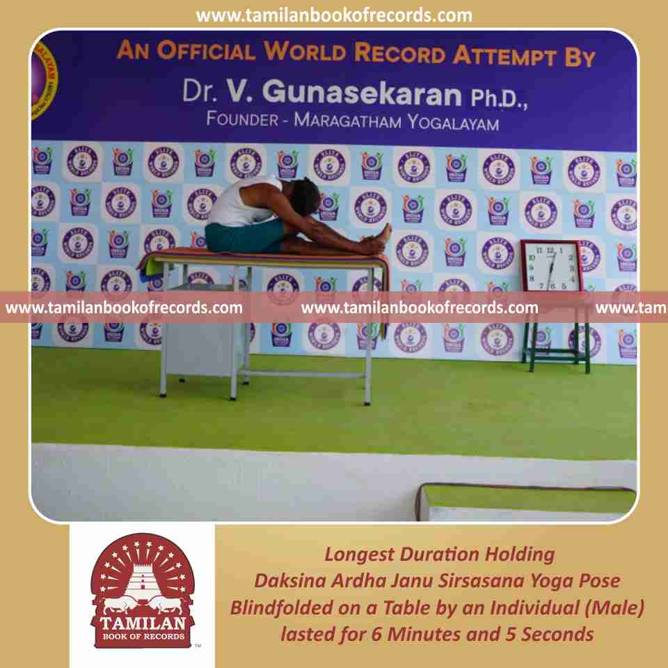 Longest Duration Holding Daksina Ardha Janu Sirsasana Yoga Pose Blindfolded on a Table by an Individual (Male)