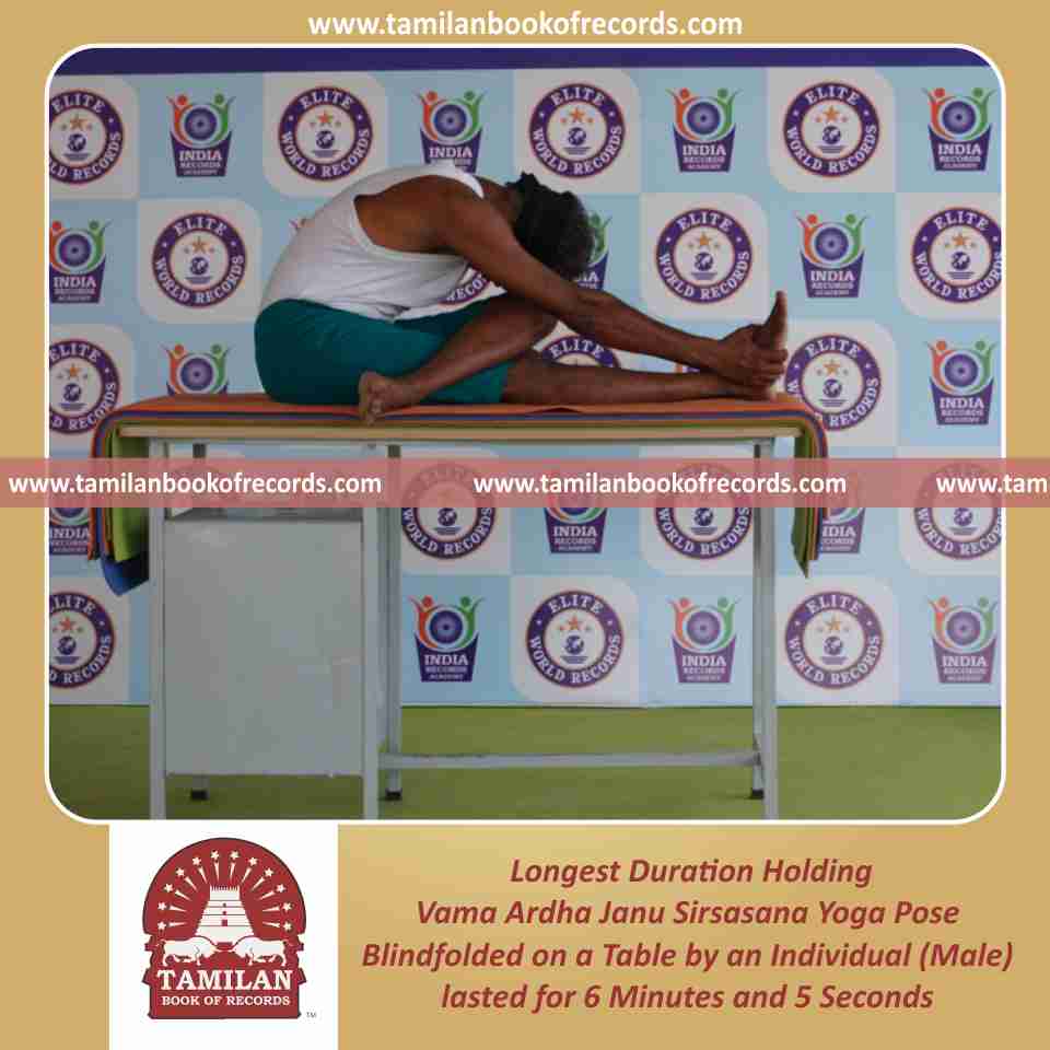 Longest Duration Holding Vama Ardha Janu Sirsasana Yoga Pose Blindfolded on a Table by an Individual (Male)