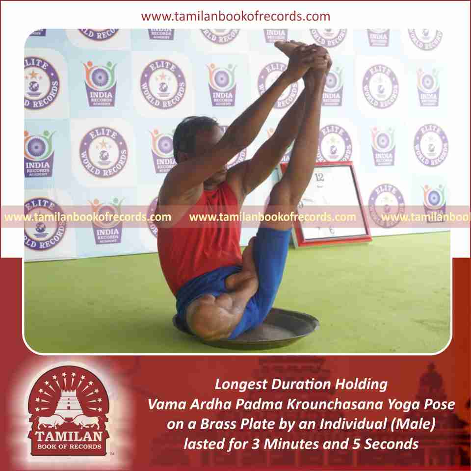 Longest Duration Holding Vama Ardha Padma Krounchasana Yoga Pose on a Brass Plate by an Individual (Male)
