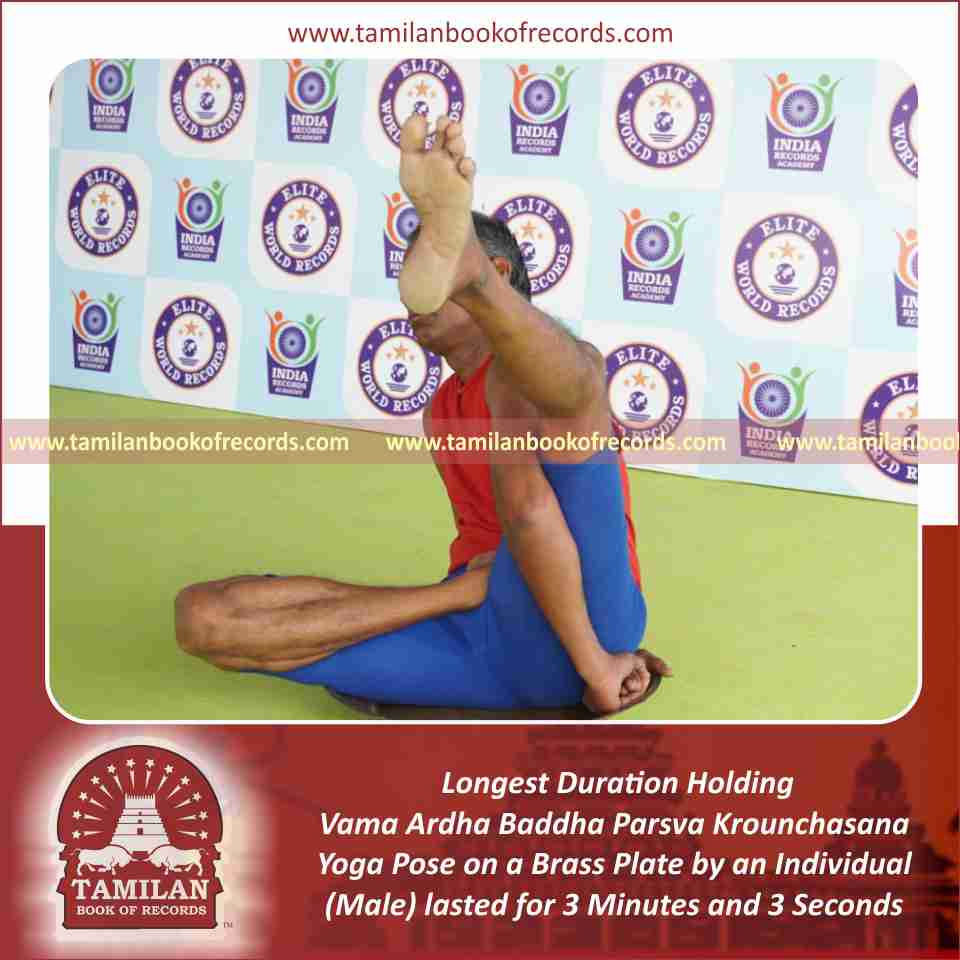 Longest Duration Holding Vama Ardha Baddha Parsva Krounchasana Yoga Pose on a Brass Plate by an Individual (Male)