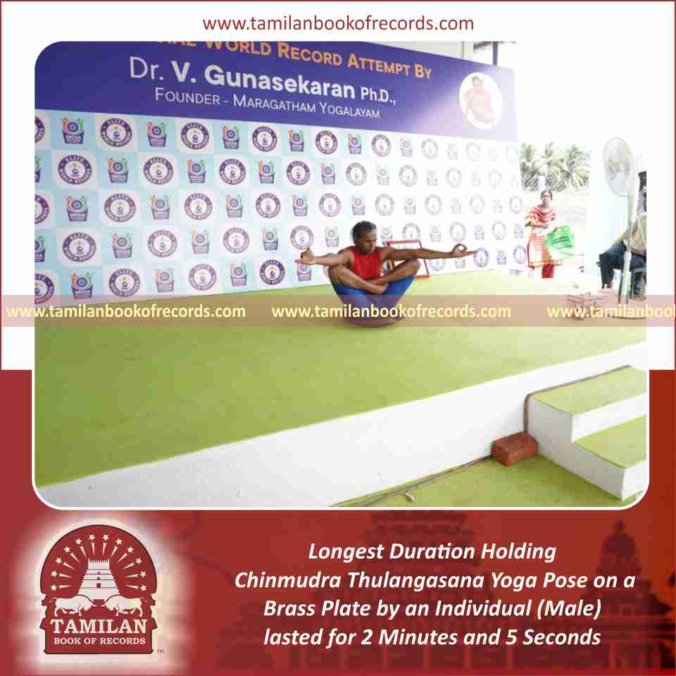 Longest Duration Holding Chinmudra Thulangasana Yoga Pose on a Brass Plate by an Individual (Male)