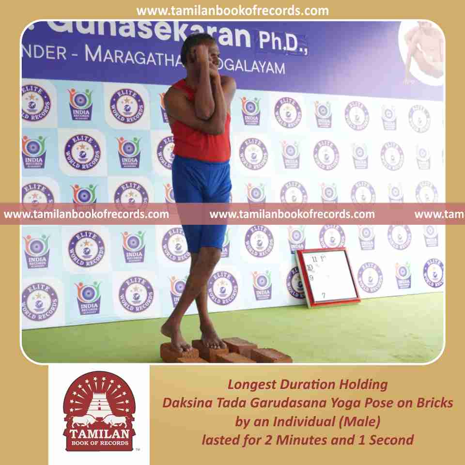 Longest Duration Holding Daksina Tada Garudasana Yoga Pose on Bricks by an Individual (Male)