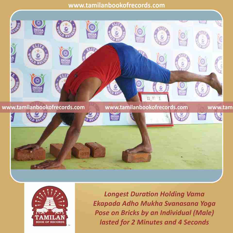 Longest Duration Holding Vama Ekapada Adho Mukha Svanasana Yoga Pose on Bricks by an Individual (Male)