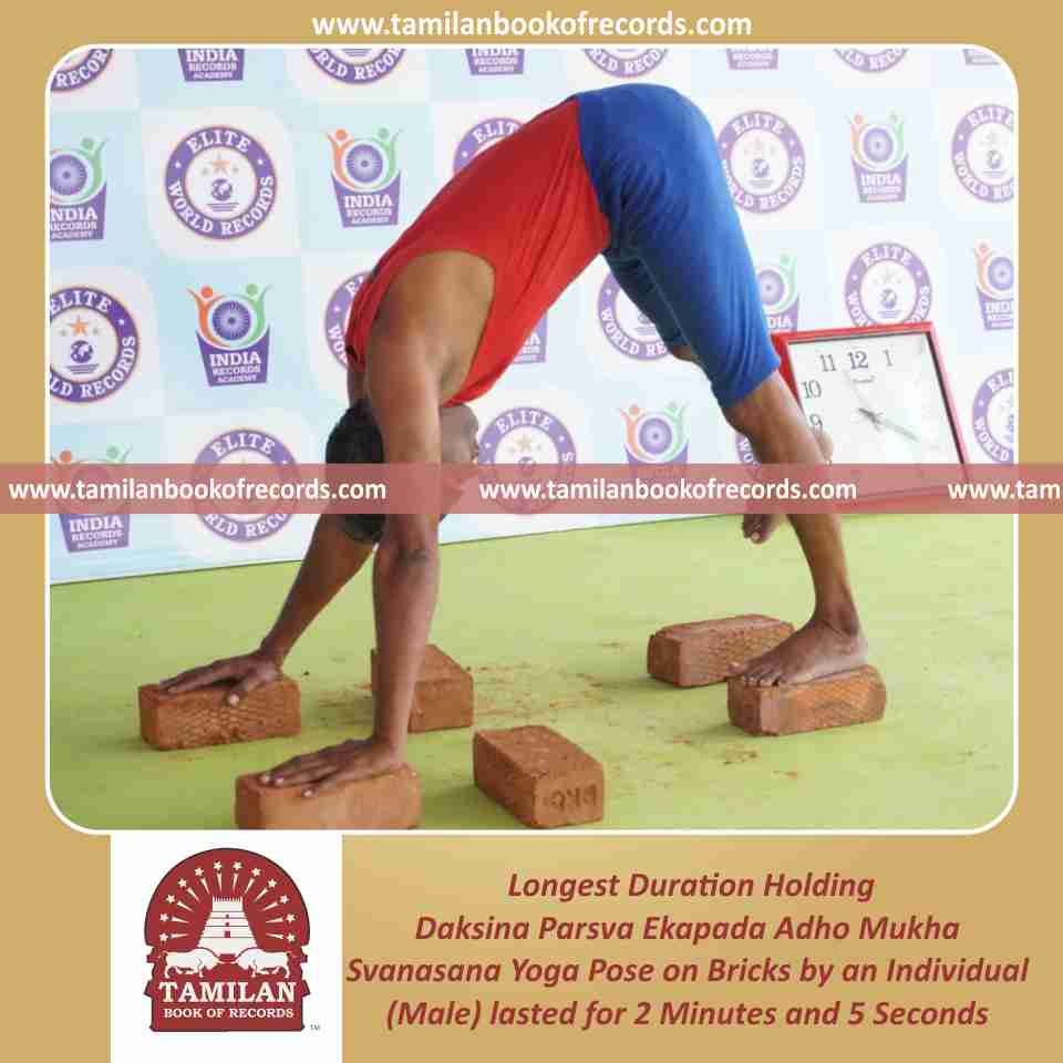 Longest Duration Holding Daksina Parsva Ekapada Adho Mukha Svanasana Yoga Pose on Bricks by an Individual (Male)