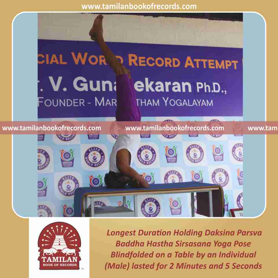 Longest Duration Holding Daksina Parsva Baddha Hastha Sirsasana Yoga Pose Blindfolded on a Table by an Individual (Male)