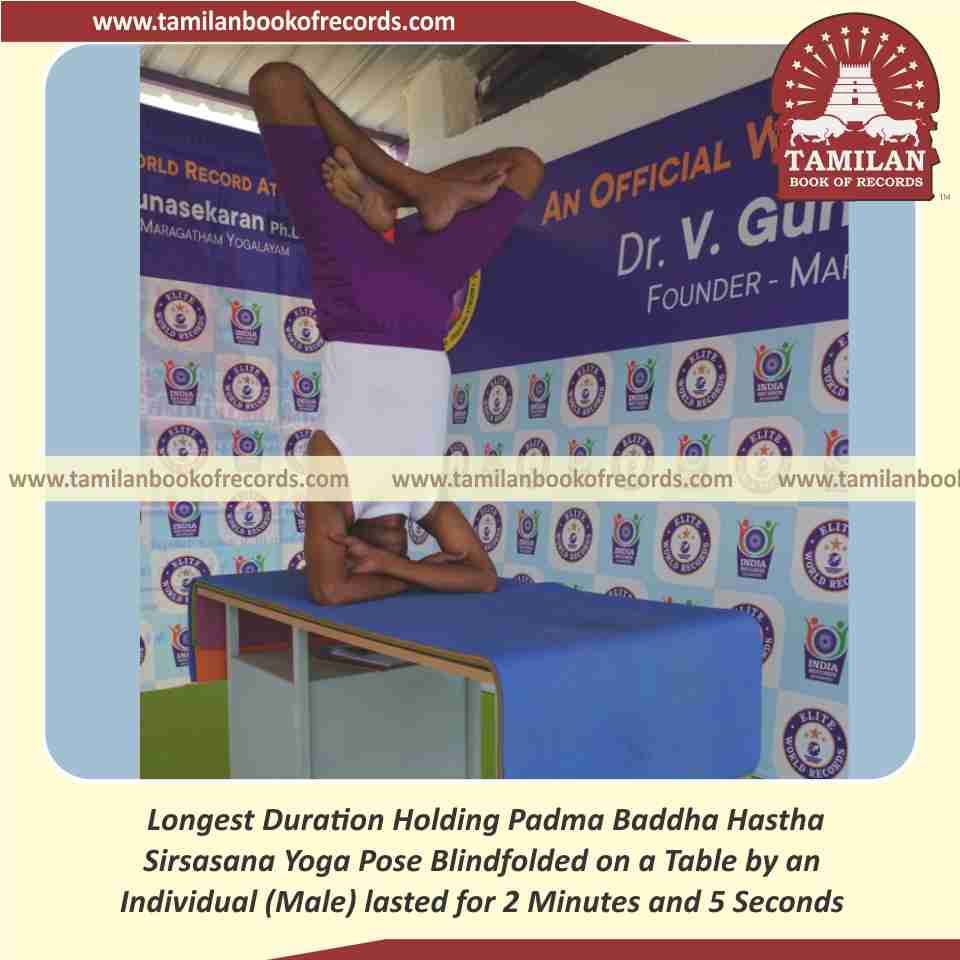 Longest Duration Holding Padma Baddha Hastha Sirsasana Yoga Pose Blindfolded on a Table by an Individual (Male)