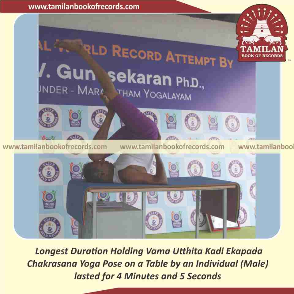 Longest Duration Holding Vama Utthita Kadi Ekapada Chakrasana Yoga Pose on a Table by an Individual (Male)